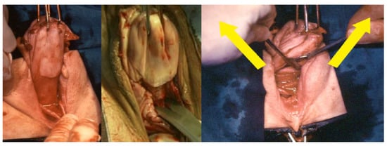 Instead, the posterior peritoneum is cut open first. This is carried out by lifting the cervix up, pulling the exposed peritoneum with surgical forceps, and cutting it open transversally with big curved and round-tipped scissors. The scissors are then inserted into the peritoneal cavity and are pulled back using both of the surgeon’s hands, pulling it out while extending the scissors on both handles. By doing so, the sacrouterine ligaments are exposed.