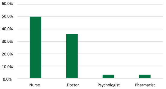 With respect to the knowledge of the caregiver regarding community resources, approximately three caregivers out of five did not know about them (n = 199, 64%). When this knowledge was present, it was mainly through the activity of social workers (n = 60, 54%) allocated to social institutions, hospitals, and parishes. Health professionals’ contributions to this knowledge were also significant to 44% of the caregivers (n = 48), of which half highlighted the nurse’s role in the process (n = 18), as Figure 1 shows. Internet (n = 18, 16%), television (n = 6, 5%), and associations/NGOs (n = 7, 2%) were also indicated as sources of knowledge.