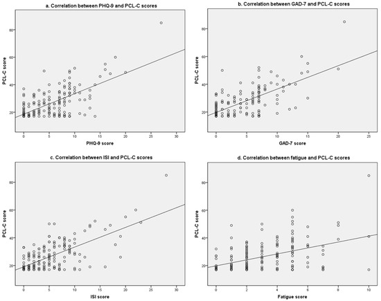 3.5. Correlations among PHQ-9, GAD-7, ISI, Fatigue, and PCL-C Scores
