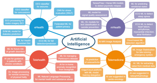 Over the last couple of years, in the context of the COVID-19 pandemic, many healthcare issues have been exacerbated, highlighting the paramount need to provide both reliable and affordable health services to remote locations by using the latest technologies such as video conferencing, data management, the secure transfer of patient information, and efficient data analysis tools such as machine learning algorithms. In the constant struggle to offer healthcare to everyone, many modern technologies find applicability in eHealth, mHealth, telehealth or telemedicine. Through this paper, we attempt to render an overview of what different technologies are used in certain healthcare applications, ranging from remote patient monitoring in the field of cardio-oncology to analyzing EEG signals through machine learning for the prediction of seizures, focusing on the role of artificial intelligence in eHealth.