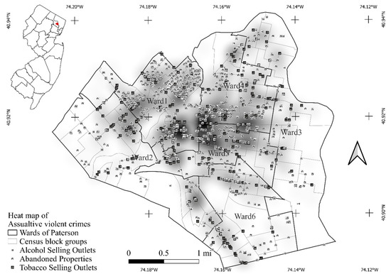This study collected various assaultive violent crime occurrences in the City of Paterson from the Paterson Police Department, which includes both aggravated assaults and robbery, from the year 2013. Actual locations where the violence occurred were geocoded and then integrated (via spatial join in a GIS) to the census block groups to produce the count information within each block group; then, a heat map was produced to show the distribution of crime in the city (Figure 1). Sociodemographic factors, which include the total population, percentage of Hispanic population, percentage of African American population, and median household income within the census block group, were obtained from the New Jersey Department of Labor, and the US Census Bureau. Tobacco (355) and alcohol (197) sales outlets information were obtained from the Paterson Alcohol Beverage Control Board (2013). The actual addresses of those outlets were geocoded and integrated (via spatial join in a GIS) to the census block group as well. Abandoned property information for 2013 was acquired from Paterson’s Housing Authority (1557), and a similar GIS operation was conducted to integrate the count to the census block group level. The map of tobacco and alcohol sales outlets and abandoned properties and the heat map of violent crimes are presented in Figure 1. A visual inspection shows clear spatial associations between urban crime/livability and the numbers of tobacco and alcohol sales outlets and abandoned properties. Still, a formal analysis is required to provide confirmation of the relationships among these factors.