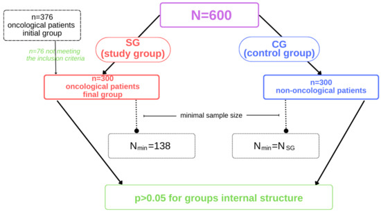 It was estimated that a sample of 300 oncology patients would be sufficient and representative of the Silesian region in Poland. It was assumed, according to the National Cancer Registry [45] and Health at a Glance 2021 OECD report [46], that the cancer incidence rate in Poland is 267 patients per 100,000, resulting in more than 101,000 cancer patients in the country and 12,000 in Silesia. Accordingly, we used the following formula: Nmin = NP · (α2 · f(1 − f)) ÷ NP · e2 + α2 · f(1 − f), where Nmin is the minimum sample size, NP is the size of the population from which the sample is taken, α is the confidence level for the results, f is the size of the fraction, and e is the assumed maximum error. The minimum sample size of oncology patients for the Poland and Silesian population was calculated as 138 people (α = 0.95; f = 0.9; e = 0.05). Based on these calculations, the collected group of oncology patients was considered representative, and the control group (non-oncology patients) was selected so that both groups were equal for ease of calculation and presentation of results.