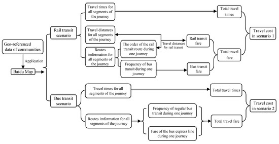 The navigation function that the Baidu map provides automatically can implement the travel schemes between any two geographic points in the city based on the travel mode choice. We made iterate inquiries with the WebAPI based on the Baidu map LBS open platform in Pythonscript. Real-time transport information for the Baidu map is estimated every two minutes based on data from multiple sources, considering not only the speed of different levels of roads but also real-time traffic congestion, which can render an estimation with a high accuracy of travel distances and travel time [39,40,41]. The road network of the Baidu map is complete and updated constantly, in which travel distances and travel times are calculated with the total for all segments along the route [36]. To reflect the reliability of travel data based on the Baidu map, we invited 10 residents who live in different communities to record their daily travel time and travel distances on public transit (including the use of rail transit or bus and transfers involving rail transit and bus), while the same period of time and same distances were calculated with the Baidu map. Fifty tests were performed. The results show that the difference between the actual travel time/distances and those calculated based on the Baidu map ranged between −10% and 10%, so the travel time and travel distances based on the Baidu map can be considered reliable.