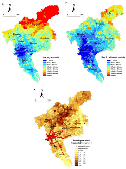 The spatial distribution of time-based accessibility of the CBD in the bus-only scenario (a), in bus and rail transit scenario (b), and the average travel speed ratio between the two scenarios (c).