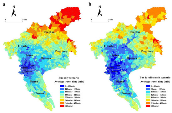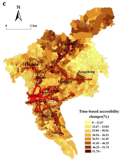 The spatial pattern of time-based accessibility is slightly reversed with the rail transit network (Figure 4b). The overall level of time-based accessibility in the city center is always the highest, indicating that the average time of reaching all major commercial complexes is the lowest, while the fringe areas need more time. The community with the longest travel time (519.42 min) is 11.3 times the community with the shrotest travel time (45.95 min) due to the improved link brought about by the rail transit lines. Figure 4c shows the percentage of changes in the time-based accessibility level between the two scenarios. This clearly highlights the transformation that would occur in communities of the Conghua District, as their time-based accessibility values in the bus-only scenario are low. The communities near the rail transit lines see high improvements, which offer virtually direct access to the commercial complexes. The lowest percentages of improvement occur in the communities of the northern Zengcheng District, which obtained an improvement value of less than 12.67%, demonstrating that they are less affected by the rail transit lines.