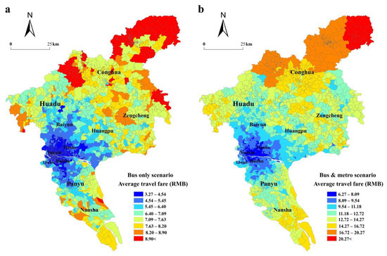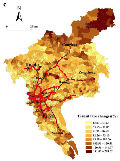 Fare cost-based accessibility was calculated and compared between the two scenarios (Figure 5a,b). In the bus-only scenario, the average transit fare for Tianhebei residential block in Tianhe District is the lowest (3.27 RMB), while communities with high transit fares are in the western Huadu District and the southern Nansha District. The average fare between the Zhoudong village of the Conghua district and major commercial complexes is the highest (12 RMB). The highest average fare is approximately three times the lowest fare. In the bus and rail transit scenario, the average transit fare between the Lvhe residential block in the Tianhe District and major commercial complexes is the lowest (6.09 RMB), while the transit fares of communities near the rail transit lines are high. Figure 5c shows the rate of change of the transit fare bbetween the two scenarios. The rail transit significantly affects the spatial distribution of transit fare-based accessibility. The spatial pattern of the changes in the time-based accessibility and transit fare is similar for the two scenarios. Communities with a high rate of change are located near the rail transit lines.