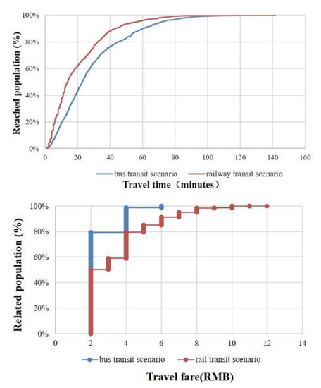 Figure 6 shows the proportion of the population in the areas within certain travel times and fare costs. Approximately 80% of the population can reach the nearest commercial complex within 43 min by bus only with a travel cost lower than 2 RMB and can reach the nearest commercial complex within 30 min with travel costs lower than 4 RMB through combined bus and rail transit.