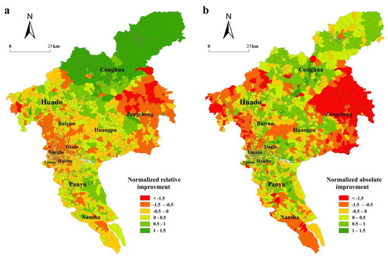 Normalized values of relative (a) and absolute (b) improvements in time-based accessibility.