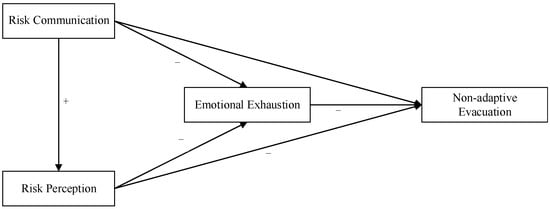 Sufficient flow of risk information is essential for effective communication between subjects. Information asymmetry exists because of the subjectivity of public cognition and promotes negative emotions about the effect of risk communication []. Previous findings show that emotions have a direct impact on individual judgment and decision-making []. Perceived risk at work can be improved through high-quality information communication between employees about the risk and a swift decision-making process that prioritizes safety []. The JD-R’s Health Impairment Process indicates that specific resources (such as time and energy) are required for conveying risk information, but these resources cause emotional exhaustion over time []. Resource depletion significantly affects safe behavioral performance of an individual. An individual’s cognitive level, social, and personal abilities complement each other and contribute to safe and efficient performance []. A chain relational model of “risk communication-risk perception-emotional exhaustion-non-adaptive evacuation behavior” was developed using the functions described above. The model indicates that risk communication enhances an individual’s level of risk perception, increases their level of alertness, and improves risk identification ability, as well as helps them overcome the emotional exhaustion caused by emergencies. These changes decrease the frequency of non-adaptive evacuation behaviors. The following hypothesis was proposed based on these findings.