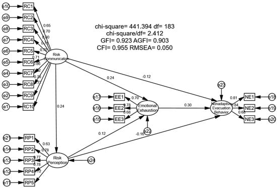 - With path factor loadings of −0.155 and −0.116, respectively, risk perception and risk communication have comparable degrees of influence on non-adaptive evacuation behavior. With a path factor loading of 0.301, emotional exhaustion has the greatest impact on non-adaptive evacuation behavior. The study’s Hypotheses H1, H2b, and H3b are all supported by the data, demonstrating that non-adaptive evacuation behavior is influenced by risk communication, risk perception, and emotional exhaustion. The results show that emotional exhaustion is a significant factor influencing people’s risky behavior during the evacuation and has the greatest impact on non-adaptive evacuation behavior. Therefore, in order to decrease the negative effects of emotional exhaustion, each organization should pay more attention to the physical and mental health of its employees, assess how emotional exhaustion affects employee safety behavior, and restrict non-adaptive evacuation behavior to lessen the negative role of emotional exhaustion.