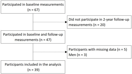 Following the inclusion criteria, 67 participants were initially included in the baseline measurements. Among them, 20 participants who did not follow-up, as well as three men and five women with missing data were all excluded from the study (Figure 1). Thus, only 39 community-dwelling women (mean age: 76.1 ± 5.9 years) were included in the analysis. None of the participants in this study had difficulty understanding instructions and expressing their intentions.