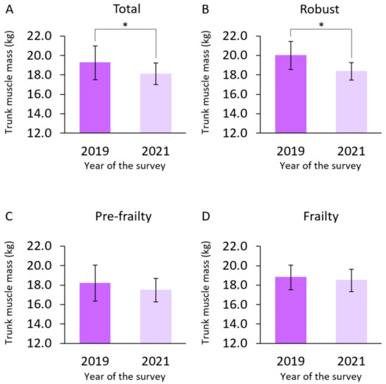 Change in trunk muscle mass by frailty status between baseline and follow-up. The bars represent mean ± standard deviation for the (A) total, (B) robust, (C) pre-frailty, and (D) frailty groups. Classified by baseline frailty status (in 2019), trunk muscle masses in 2019 and 2021 were compared using paired t-tests. A significant decrease was observed in the robust group but not in the pre-frailty or frailty groups. In the study period, 2019 corresponds to before the onset of the COVID-19 pandemic, and 2021 corresponds to during the pandemic; * p value < 0.05.