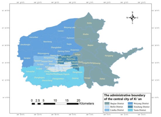 7], understanding the variation in demand can help decision makers to better arrange the geographical distribution of facilities and the related service hours. Therefore, scientific accessibility analysis is the basis for judging the variability of regional elderly services and optimizing the spatial allocation of resources. Spatial accessibility includes three basic elements: population, service supply level, and distance. The two most commonly used models for accessibility evaluation are the potential model and the two-step floating catchment area method (2SFCA) model. Xi’an is an important city in the development of Western China. At present, under the active guidance of national policies, elderly care facilities are developing rapidly in terms of quantity and quality, but the problem of an unbalanced supply–demand structure is still prominent. Therefore, the application of scientific methods to evaluate the spatial accessibility of Xi’an elderly care facilities can help researchers to better understand the layout of elderly care facilities and alleviate the problems brought by the aging society. According to Sunwei Liu [