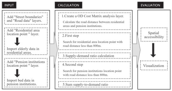 The two-step floating catchment area (2SFCA) model measures spatial accessibility in two steps. First, it determines the number of people in the neighborhoods near each elderly care facility to calculate the supply–demand ratio within the search radius. Then, for each residential area, it searches all elderly care facilities within the threshold travel time and determines the supply–demand ratio to derive the accessibility value of the residential area. The 2SFCA method is widely used for the evaluation of accessibility in public service facilities such as healthcare services [