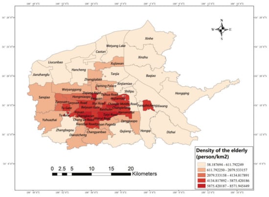 Xincheng District, Beilin District, and Lianhu District are the old urban areas of Xi’an, and are the political, economic, and cultural centers of Xi’an. Among them, the service scope and service types undertaken by the elderly care institutions facilities in Qingnian Road Street, Jiefangmen Street, Beiyuanmen Street, and Taiyi Road Street are obviously higher than those of some elderly care institutions in the peripheral areas, which require higher-quality service facilities and the corresponding highly trained staff, and their location choices clearly reflect the economic orientation of the residents. The old city has highly developed economic conditions, refined infrastructure, and convenient transportation, and these factors ensure the normal operation of elderly care institutions; therefore, a large number of elderly care institutions are laid out in this area, making it a high-value area for the accessibility of elderly care institutions.