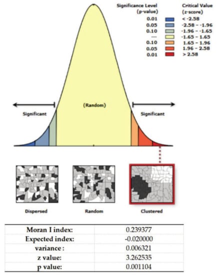 Table 1, the regional accessibility average is 0.1369 when the distance-decay factor is not considered, and the accessibility average is 0.0887 after considering the distance-decay factor. The former service accessibility is 0~3.8495 (
