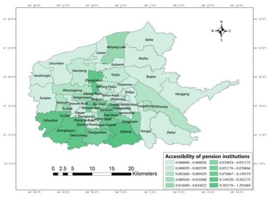 This study improved a model for the evaluation of the accessibility of elderly care institutions in the main urban area of Xi’an, and quantitatively evaluated and graphically expressed the accessibility of elderly care institutions with the help of spatial analysis and the visualization functions of GIS. The method adopted in this paper has the following advantages: (1) Considering that elderly people give preferential priority to high service quality and proximity to their homes in decision making, the introduction of the selected probability function means that the model reflects reality more closely, meaning that the results are more accurate; therefore, the layout planning of urban stock space can be better facilitated. (2) The search radius involves distance decay; instead of choosing the plane Euclidean distance, the actual shortest distance along the route is combined with the real road network, thus providing a more accurate calculation result. (3) The service targets of elderly care institutions are members of the elderly population, so the search radius and the distance from the institution to the residential area should be combined at two points with the travel characteristics of the elderly; additionally, in this study, we used the walking speed of the elderly as the travel threshold for the calculation, which is more relevant for these calculations in assessing solutions for the problems that arise with an aging population. (4) With the help of ArcGIS, the results of the evaluation of accessibility were expressed in the form of maps by street offices, which can comprehensively show the spatial distribution characteristics of elderly care facilities. The results of this study can help researchers and decision makers to understand the spatial accessibility of elderly care institutions in the main urban area of Xi’an and can provide a reference for scientific research, effective planning, reasonable site selection, and the layout of elderly care facilities.