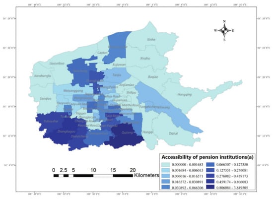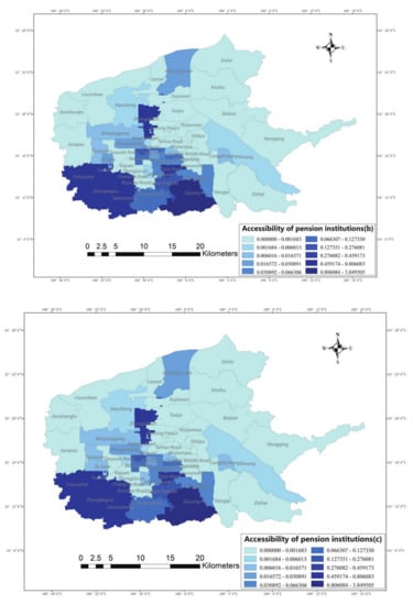 Figure 8a), which indicates that the accessibility difference between the six main urban areas of Xi’an is smaller after considering the actual path. Considering the construction of elderly care institutions in relation to the aging of Xi’an in recent years and the selection of the actual path as the distance between two points, (