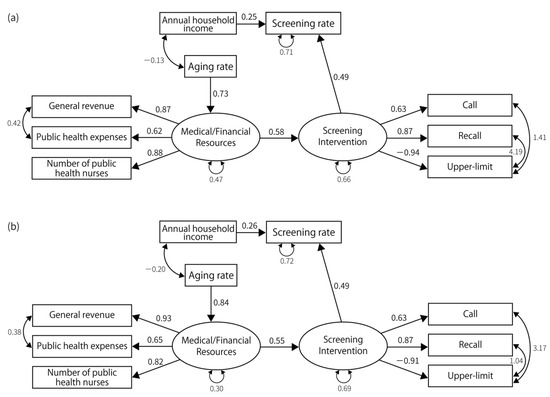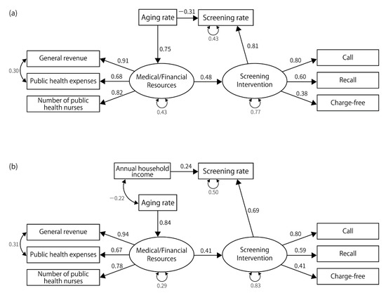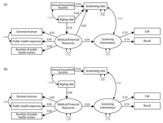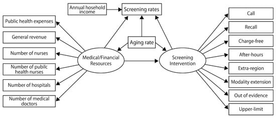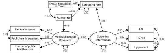 The SEM was conducted to visualize the relationship between these variables and the screening rates. We defined two latent variables—medical/financial resources and screening interventions—and hypothesized that these latent variables affected screening rates directly, while medical/financial resources affected screening interventions. Other details of the prespecified model based on the hypothesis are shown in Figure 1.