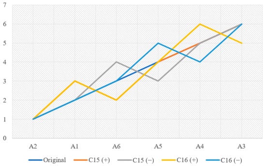 With respect to the 10% variation, no impact was observed; that is, the order did not change in any situation. However, for 20%, when the weights decreased and increased, stability was, on average, 96.30 and 94.44%, respectively. The only classification changes occurred when the sub-criteria and increased and decreased, as shown in Figure 2.