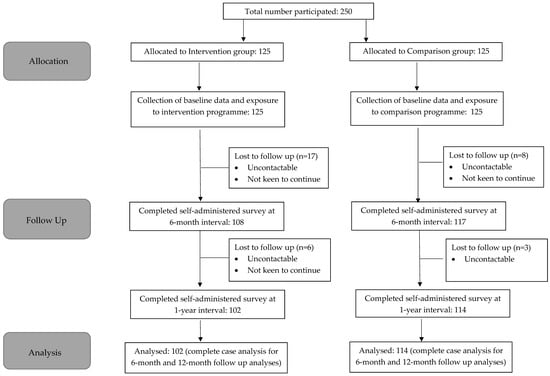 A total of 250 participants were recruited at baseline, with an equal number of participants recruited at the intervention site (n = 125) and control site (n = 125). At the 6-month follow-up, a total of 225 participants continued the study, with 108 participants from the intervention group and 117 participants from the comparison group. A total of 25 participants dropped out due to time constraints, or they were uncontactable. The number of participants who completed the study at the 1-year follow up was 216, with 102 participants from the intervention group and 114 participants from the comparison group, with a follow-up rate of 86%. Participants dropped out of the study because they were uncontactable or uninterested to continue in the study due to time constraints (Figure 1).