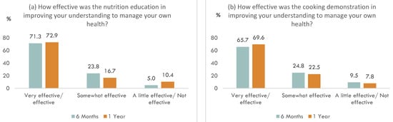 Figure 2 shows the results of the process evaluation in the intervention group. At both the 6-month and 1-year follow-up, more than 70% of the participants in the intervention group reported that the nutrition education was effective/very effective in improving their understanding to manage their own health. This was similar for the case of the cooking demonstration, where the proportion was more than 65% at the two follow-up time points. For confidence to manage their health, more than 70% of the participants in the intervention group reported that the nutrition education was effective/very effective in helping them to achieve that. This was similar for the case of the cooking demonstration, where the proportion was more than 65% at the two follow-up time points. At both the 6-month and 1-year follow-up, more than two-thirds of the participants in the intervention group reported at least a moderate change in their eating habits. This was similar for the case of the cooking habits.