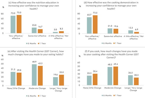 Results of the process evaluation in the intervention group; (a) Effectiveness of the nutrition education in improving understanding to manage own health, (b) Effectiveness of the cooking demonstration in improving understanding to manage own health, (c) Effectiveness of the nutrition education in increasing confidence to manage own health, (d) Effectiveness of the cooking demonstration in increasing confidence to manage own health, (e) Changes to eating habits after visiting the Health Corner, (f) Changes to cooking habits after visiting the Health Corner.