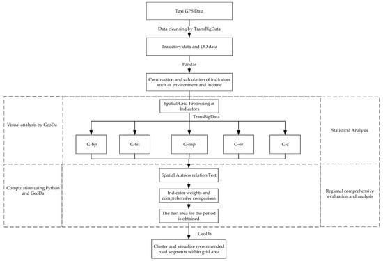 This study exploited a gridding method to process the trajectory data and calculate the driver’s benefits and the emission indicators in the region. Spatial autocorrelation tests were applied to verify the variability of indicators for similar regions of travel demand. Then, the weights of these indicators were measured, and the hotspot grid was determined. Finally, the hotspot grid was clustered and analyzed to narrow the region to road segments. Figure 1 illustrates this process.