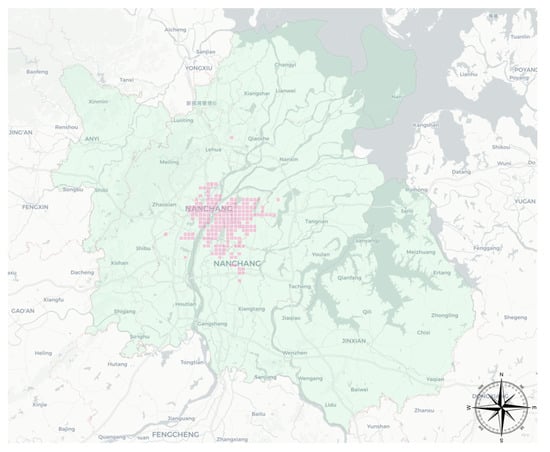 Nanchang, located in central China, is the capital city of Jiangxi Province. Nanchang’s per capita GDP was 143,157 RMB (about 16,083 USD) in 2021 and is one of the first provincial capitals in the central region to be piloted as a low-carbon city in China. The taxi business in Nanchang is responsible for the transportation needs of the core areas of Nanchang. The monthly income of taxi drivers is mostly 6000–8000 RMB, which is lower than the per capita income level in Nanchang. According to the Nanchang City Development and Reform Commission published by the Nanchang City taxi tariff. The starting price is 8 RMB/km, the per kilometer price is 2.1 RMB/km, the driving distance exceeds 8 km though the part of 50% of the emptying subsidy, night 11:00 p.m. to 5:00 a.m. plus 20% of the kilometer subsidy fee. The order revenue is calculated by this in this study. The study area is located in the administrative area of Nanchang city (light green in Figure 3, total 7553 grids). The main passenger-carrying areas of taxis are located in Xihu District, Qingyunpu District and Qingshan Lake District (light red in Figure 3, 196 grids), and the grid unit is 1000 × 1000 m.