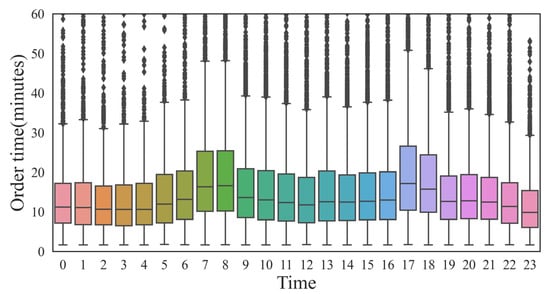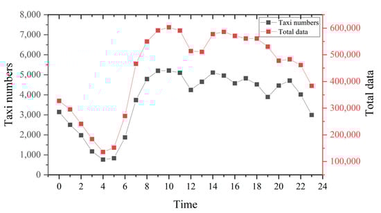 Travel demand by taxi travel varied greatly during the day. Figure 4 shows that the travel activity peaked at 9:00 a.m. to 11:00 a.m., and the lowest value appeared between 4:00 a.m. and 6:00 a.m. Travel activity was relatively inactive between 12:00 p.m. and 2:00 p.m. Most Chinese people were used to rest during this period. The number of taxis was consistent with the trend of GPS data volume. Figure 5 shows that the overall order duration was maintained at 5–20 min, which is in line with the actual situation. Orders from 7:00 a.m. to 9:00 a.m. and 5:00 p.m. to 7:00 p.m. took longer, about 5 min, which may be due to more congested roads. To study the temporal characteristics of taxi trips, four periods were selected. The length of the extracted period was set to two hours concerning the duration of the peak hours. Morning and evening peak periods (7:00 a.m. to 9:00 a.m., 5:00 p.m. to 7:00 p.m.), early morning period (1:00 a.m. to 3:00 a.m.), and night period (8:00 p.m. to 10:00 p.m.).