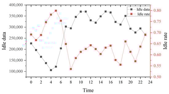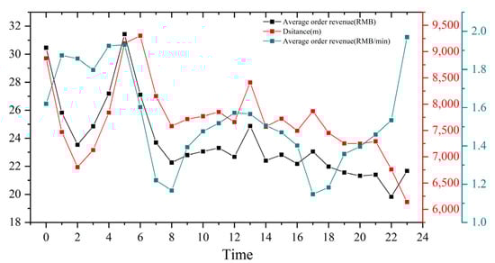 The reasonableness of the number and operation of taxis is reflected by the taxi idling rate, which is calculated by calculating the ratio of the idling points to passenger carrying points. Figure 6 shows that the idle rate was lowest in the morning and evening peak periods (1:00 a.m. to 3:00 a.m. and 5:00 p.m. to 7:00 p.m.), but the idle rate was over 50% throughout the day and even close to 80% in the early morning period (1:00 a.m. to 3:00 a.m.). Taxi drivers were looking for passengers more than half of the time. The order revenue by taxi travel varied during the day (Figure 7). The morning and evening peak periods were the easiest time to get orders but also the least efficient time for revenue. The average order revenue was about 1.1 RMB/min, during daytime off-peak periods, this value was about 1.4–1.5 RMB/min, in the early morning period exceeding 1.8 RMB/min. Compared with the peak periods, about 30–60% were higher. In addition, the average distance traveled throughout the day was about 7.5 km, and the income per trip during the daytime period was about 22 RMB. The early morning periods are higher than daytime periods, up to 31 RMB.