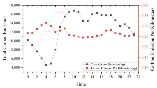 Carbon Emission Per Kilometers (CEPK) is a global standard metric that provides a more objective assessment of carbon emissions and is calculated by dividing total travel emissions by total travel distance. Figure 8 shows that the CEPK remained around 0.25 kg/km despite the large variation in total carbon emissions per hour. During the 4:00 a.m. to 5:00 a.m. period, the total emissions were 4570 kg, which increased to 16,813 kg during the peak period, an almost 4-fold increase. This figure decreased slightly from 12:00 p.m. to 2:00 p.m. noon and increased again in the afternoon, with a total emission of about 300 tons throughout the day. Combined with Figure 6, it can be found that a large part of Nanchang taxi emissions come from idle trips.