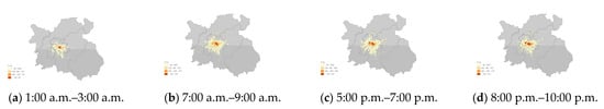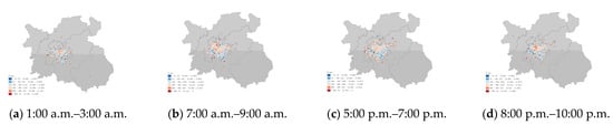 The G-oap had spatial heterogeneity in the grid distribution. An interesting conclusion from comparing Figure 9 was that high travel demand areas were not high-order acquisition probability areas. Figure 11 shows that the G-oap of the grids with higher travel demand were almost all in the 50% to 90% range of the overall data, but the distribution of the easiest areas to acquire orders (90% to 99%) appeared scattered. The early morning period was the most difficult time to obtain orders and the number of grids was also the least. Relatively low revenue in the central city and higher revenue in the suburbs (Figure 12). Revenue from travel hotspots was generally distributed between 10% and 50% of the overall data. This means that, although these areas generated more orders, their earnings during this period were not considerable compared to other regions. Taking orders at night had the highest revenue because extra night surcharges were charged at night. Morning and evening peak periods were the lowest revenue periods for taxi drivers. Even though there was already a high range of travel demand at this time, poor traffic conditions still had a negative impact on drivers’ revenue efficiency. This disturbance was most pronounced during the evening peak period.
