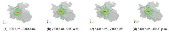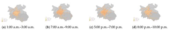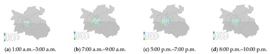 (a) Grid boarding points (G-bp) of each grid area at 1:00 a.m.–3:00 a.m. (b) Grid boarding points (G-bp) of each grid area at 7:00 a.m.–9:00 a.m. (c) Grid boarding points (G-bp) of each grid area at 5:00 p.m.–7:00 p.m. (d) Grid boarding points (G-bp) of each grid area at 8:00 p.m.–10:00 p.m.