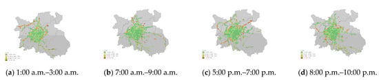 The three aspects of traffic condition, driver revenue, and carbon emission in the grid were subdivided into G-bp, G-tsi, G-oap, G-or, G-c, and G-avgc. The distribution characteristics of the indicators in the grid and their dynamics over time were explored. (periods selected were 1:00 a.m. to 3:00 a.m., 7:00 a.m. to 9:00 a.m., 5:00 p.m. to 7:00 p.m., and 8:00 p.m. to 10:00 p.m. in Figure 9, Figure 10, Figure 11, Figure 12 and Figure 13)
