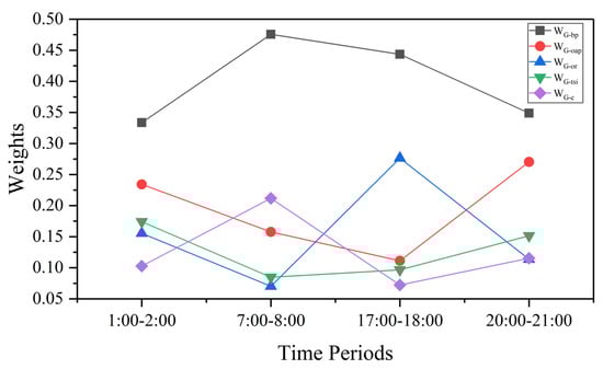 The study exploited G-bp, G-oap, G-or, G-tsi, and G-c, five indicators to determine the recommended grids (G-tsi and G-c are negative indicators). Due to the high concentration of taxi activities in Nanchang, demand varies greatly. The travel demand varies greatly between grids, and the top two grids (17 to 35 grids) with the largest travel volume in Figure 9 were selected and comprehensively evaluated. As shown in Figure 15. The weighting of the indicators varied from period to period, but (G-bp) travel demand remained the most important factor. The lowest weight is 0.33 in the period 1:00 a.m. to 3:00 a.m., and the highest is 0.48 in the period 7:00 a.m. to 9:00 a.m. The secondary weight is different in each period. In the period 5:00 p.m. to 7:00 p.m., G-or became the secondary weight (0.28), in the period 7:00 a.m. to 9:00 a.m. G-c became the secondary weight (0.21), and in the period 8:00 p.m. to 10:00 p.m. G-oap became a secondary weight (0.27). The comprehensive ranking of the grid was determined by the weight of the multiple indicators. For example, the grid numbered (68,84) in the period from 5:00 p.m. to 7:00 p.m. was not in high-trip demand. However, the relatively remote location allowed drivers to earn more emptying subsidies and higher travel speeds, resulting in higher rankings in this area than in other areas during the same period. Table 6 lists the top five grid areas and the specific values of their indicators in the four periods. The high-ranking grids in different periods were not fixed, but the spatial positions of the recommended grids were relatively close.