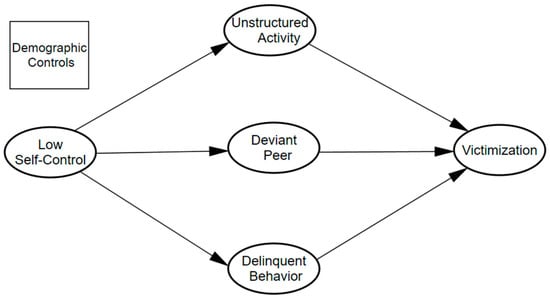 In the current study, we explore a full mediation model to test whether low self-control indirectly affects victimization through risky lifestyles (unstructured activity, association with deviant peers, and delinquent behavior), controlling for other demographic factors. The conceptual model guiding the current research is presented in Figure 1. Unlike previous research, in this study, we frame the indirect effect of low self-control on victimization as originally implied by Schreck [6] and investigate whether the mediation (indirect) hypothesis is the best fitting model. An alternative model is also tested in which direct effects of low self-control on victimization are included.