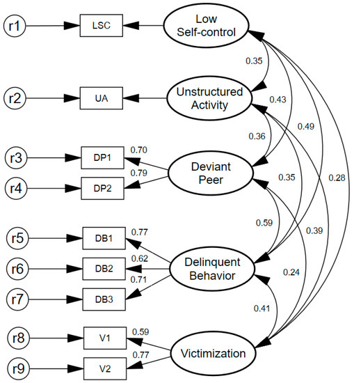 Figure 2 presents the results of the measurement model with correlation coefficients between the latent factors and factor loadings for the construct indicators. All factor loadings for latent variables were above 0.500 and statistically significant (p < 0.001), indicating that all of the selected indicators are acceptable in terms of the extent to which they appropriately reflect their underlying concept. There were no Heywood cases, and the indicators for low self-control and unstructured activity were set to 1.00.