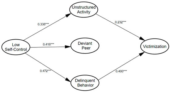 Although prior studies conducted in the context of South Korea have suggested a direct relationship between low self-control and victimization [8,9], the results of the current study demonstrate that low self-control had no direct effect on victimization. Rather than a direct effect, the findings reveal that low self-control only had an indirect effect on victimization, primarily through two intervening mechanisms: involvement in unstructured activities and delinquent behaviors. This finding is in line with integrative perspectives, suggesting that the risk of victimization is a byproduct of low self-control, as it affects individuals’ lifestyle choices and behaviors, resulting in vulnerability to victimization [6,7]. More specifically, low self-control was associated with risky lifestyles. Youths with low self-control tended to allocate their time to unstructured/unsupervised activities with deviant peers away from responsible authority figures and engage in criminal behavior. These risky activities, particularly unstructured activity and delinquent lifestyles, lead increased risk of adolescent victimization. These findings highlight that risky lifestyles/routine activities, such as unstructured activities, association with deviant peers, and delinquency, leading to victimization might reflect an individual’s preference and personality, as such activities may provide pleasurable short-term benefits and immediate gratification [2,6,37].