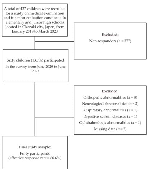 From the 437 children eligible for participation in this study, only 60 who had participated in at least one medical examination before the COVID-19 pandemic were included in the sample. The data obtained from the participants were evaluated only once before and during the COVID-19 pandemic. The exclusion criteria included individuals suffering from orthopedic, neurological, respiratory, and ophthalmologic issues as well as those suffering from digestive system disorders and intellectual disabilities, as indicated through substandard scores on the Peabody Picture Vocabulary Test-Revised and Raven’s Colored Progressive Matrices [,], which could affect the results of physical function assessments, thereby generating incomplete data. As a result, 20 out of 60 children were excluded, thereby providing 40 participants who constituted the final sample used in this study (Figure 1).