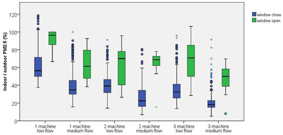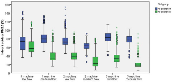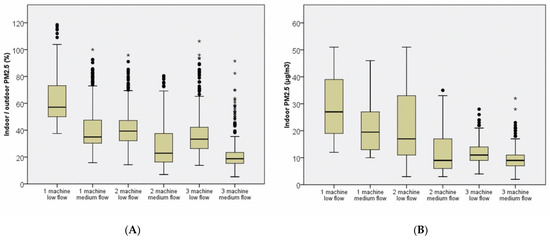 | Group | Flow (n) | Outdoor PM2.5 µg/m3 | MD | Indoor PM2.5 µg/m3 | MD | p Value | Indoor /Outdoor PM2.5 % | MD | p Value |