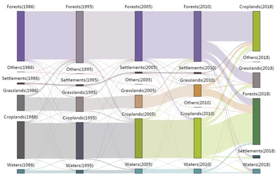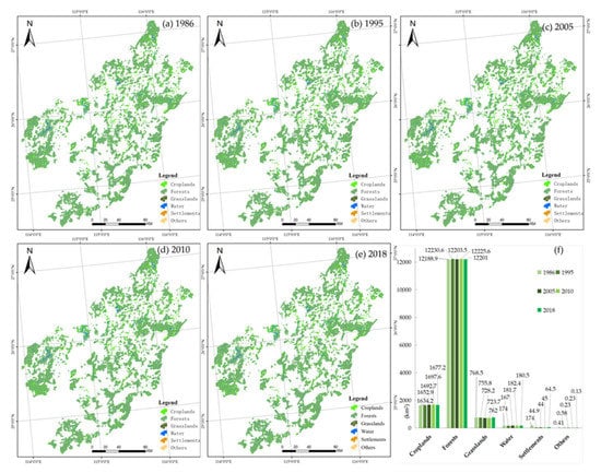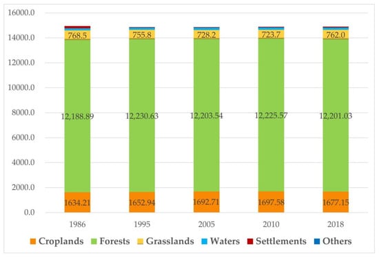 - The natural ecosystems in the study area keep relatively stable during 1986–2018. According to the indices at the landscape scales, the degree of landscape fragmentation in the study area decreased from 1986 to 2005. The diversity and richness of the landscape gradually increased from 2010 to 2018. The dominant characteristics of the forests were enhanced. The proportion of landscape types that have succeeded is very small. The ecosystems and aggregation can recover quickly after being disturbed by human activities.