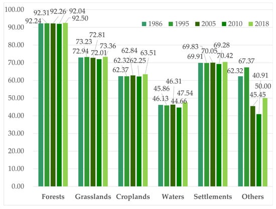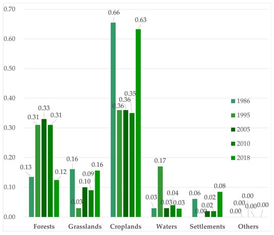 - The conversion of large-scale croplands to forests could be the key to maintaining the stability of the ecosystem in the future in the ERL. Croplands account for approximately 11% of the total area. It is important to return croplands to forests so as to reduce the impact of human activities on the ecosystem. Croplands are easily driven by policy and the economy, and the proportion of croplands in the study area is more scattered, less connected, and low in aggregation. The patch of croplands is relatively fragmented and has difficulty forming a scale advantage. The natural conditions have an obvious restrictive effect on agricultural development. Expanding human settlements indicate that a combination of increasing yields from highly productive agricultural land and converting marginal grasslands and agricultural land to forests would yield greater benefits from the delivery of essential ecosystem services such as watershed protection and biodiversity conservation. Under the expansion condition of human settlements, the transformation of large-scale croplands to forests could be the key to maintaining the stability of the ecosystem in the study area.