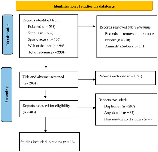 As shown in Figure 1, the primary search identified 2304 relevant articles. After eliminating studies on animal and on unhealthy subjects and reviews, and after the screening of titles and abstracts, 403 studies were considered eligible. From these, duplicates and non-randomized studies were then eliminated and, in accordance with the inclusion and exclusion criteria (Table 1), 16 studies [20,21,22,23,24,25,26,27,28,29,30,31,32,33,34,35] were selected for this systematic review.