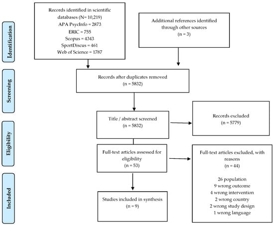 The literature search was conducted in ERIC, APA PsycInfo, Scopus, SPORTDiscus and Web of Science. Studies published between 1 January 2000 and 6 April 2022 with full text in either Danish, Swedish, Norwegian, English or German were included. Duplicates were removed before starting the review process. The review process followed the inclusion and exclusion criteria (see Table 1).