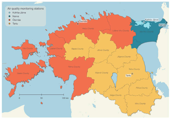 The exposure assessment included two levels of assessment: a combined method using measured and modeled data to catch temporal and spatial differences, and residential proximity to the oil shale industry. For the combined method of measuring and modeling the air pollution, first, the measured particulate matter (PM10), fine particles (PM2.5), and nitrogen dioxide (NO2) concentrations were calculated for each child according to daily average data in the nearest representative urban background air quality monitoring station (Figure 1) during the first and last trimester (gestational weeks 1–13 and from 28 until birth, respectively). Second, the annual mean concentrations of PM10, PM2.5, and NO2 were modeled in 1 × 1 km grids using an Eulerian air quality dispersion model that formed part of the Airviro Air Quality Management System (Apertum IT AB, v5.01, http://airviro.com (accessed on 5 January 2022)); see the detailed description in the Airviro Documentation [69]. Industrial pollutant emission levels in 2017 were retrieved from the ambient air emission database OSIS2017, which consists of annual emissions (tons per year) of more than 40 different pollutants and substance classes (incl. PM10, PM2.5 and NO2) reported by companies and validated by the Estonian Environmental Board. Same year transport–sector emissions came from the traffic emissions database Traffic2017, domestic heating emissions from the local heating emissions database Localheating2017, both compiled by Estonian Environmental Research Center, and agriculture emissions. The modeled concentrations were validated with measurement data obtained from the monitoring stations all over Estonia and with concentrations measured by passive samplers. For visualization, the model output was generalized and classified into seven classes, using the ArcGIS (v10.3, ESRI, Redlands, CA, USA) scripting environment ArcPy. In ArcGIS, the annual concentrations of modeled pollutants per grid cell were linked with the geocoding of each child’s home address at the moment of birth. During the geocoding, the geographical coordinates of the address points were found according to the textual addresses. The public geocoding service of the Land Board was applied, which is available on the website as Address Data Geocoding [70]. Third, the measured concentrations were adjusted according to the difference in modeled concentration between levels at the home address and in the nearest temporal trend in the representative monitoring station. For measuring and modeling the pollutants, the following monitoring stations were used as shown in Figure 1: Tallinn Õismäe (Baltic Sea bordering Counties), Tartu (inland Counties), and Narva and Kohtla–Järve (municipalities in Ida-Viru County).