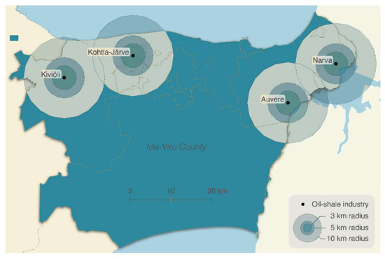 Oil shale industries in Ida-Viru County and 3 km, 5 km, and 10 km buffers around them. Basemap: © Land Board.