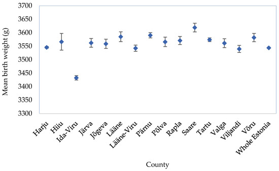 At the national level, the prevalence of LBW and PTB was 3.3% for both indicators; however, Ida-Viru County has a higher prevalence: 4.8% for LBW and 4.3% for PTB (Table 1). Furthermore, Figure 3 depicts that the average birth weight was lower in Ida-Viru County than in any other county and 124.5 g lower than the national average of 3544 g.