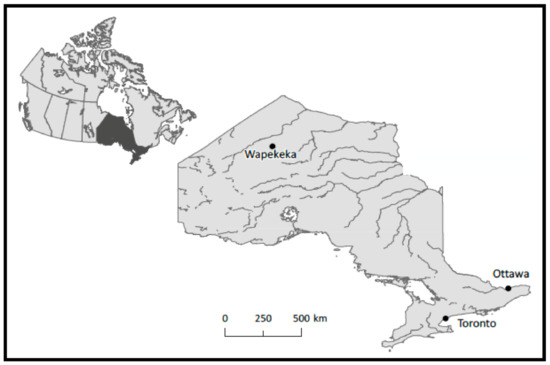 - Robidoux, M.A.; Mason, C.W. A Land Not Forgotten: Indigenous Food Security and Land-Based Practices in Northern Ontario; University of Manitoba Press: Winnipeg, MB, Canada, 2017. [Google Scholar]