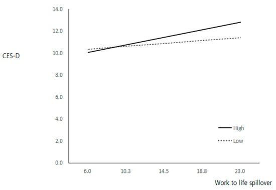 Hierarchical multiple regression analysis was conducted, as shown in Table 4 and Figure 2. In Model 4, the interaction terms between work-to-life negative spillover and social activity satisfaction were statistically significant (β = 0.176, p < 0.05). In other words, it was found that the moderating effect of social activities satisfaction was significant in the relationship between work-to-life negative spillover and depressive symptoms. As shown in Figure 2, depressive symptoms and work-to-life negative spillover increased in both the high and low social activity satisfaction groups, but the low social activity group showed less depressive due to the negative spillover than the high group. In sum, it was confirmed that the effect of work-to-life negative spillover on depressive symptoms was different according to the degree of social activity satisfaction.